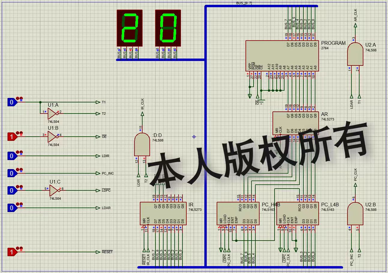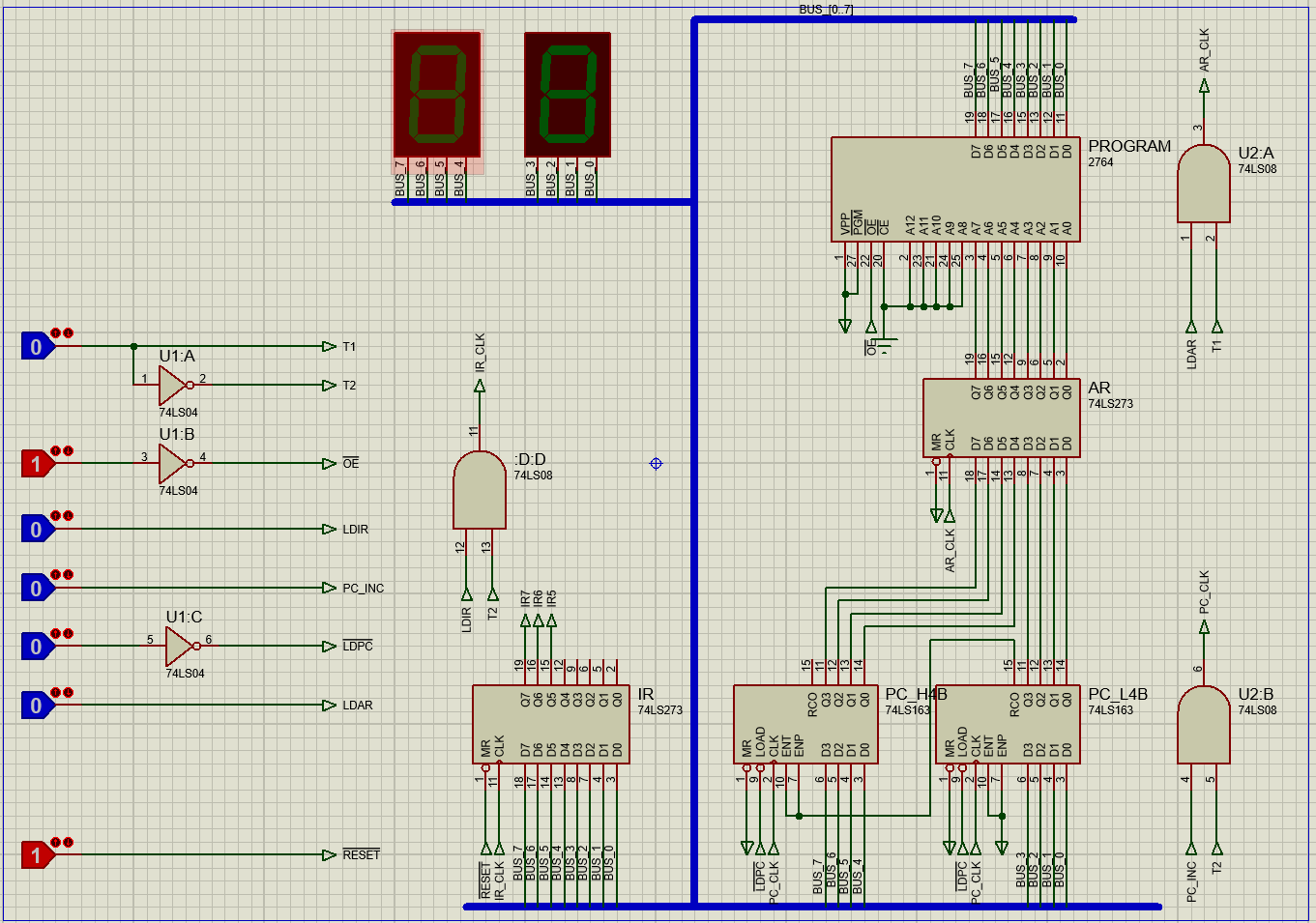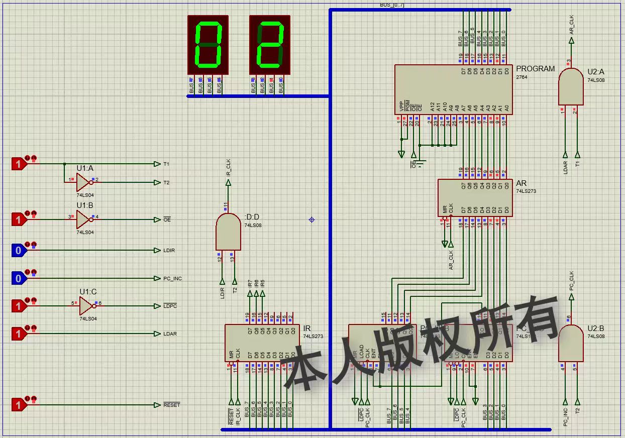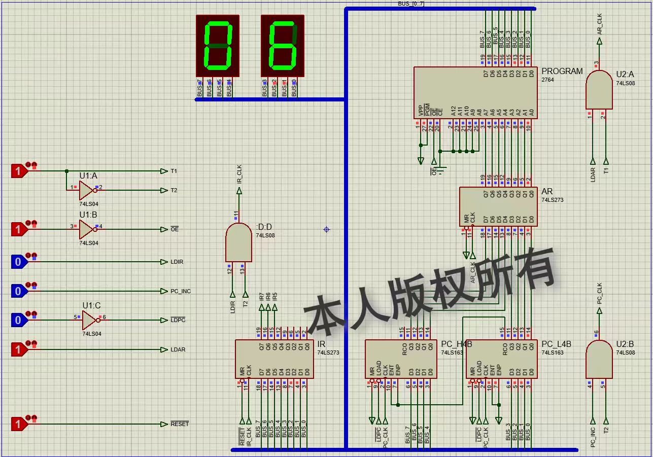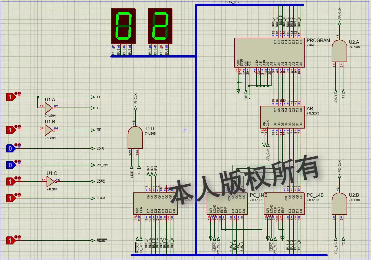 切换T1/T2,LDAR,LDPC的非置0,再打开LDPC的非(置1),跳变PC_INC(0->1->0),LDAR置1,切换T1/T2: