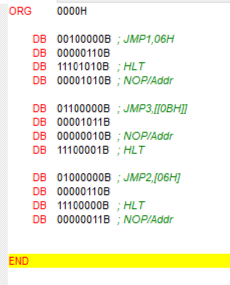 查看一下PROGRAM中的地址和数据,系统从0000H开始读,jump1的标志是00100000(20),jump2的标志是01000000(40),jump3的标志是01100000(60),左边的每一行对应右边00H~0BH每个地址: