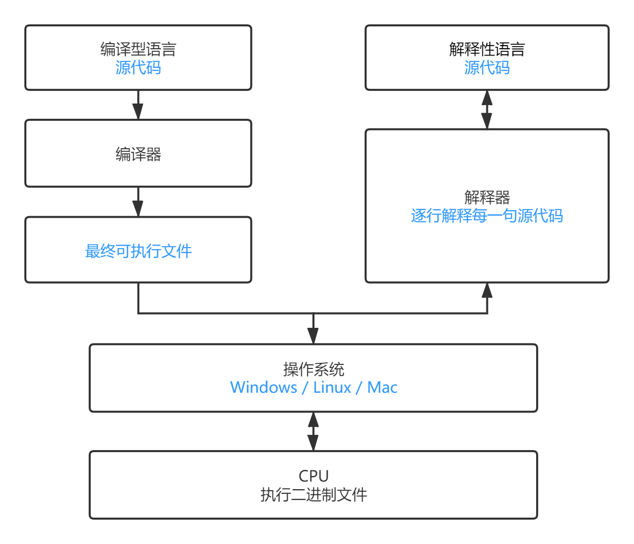 | 解释型语言 | 由专门的解释器,根据需要将部分源代码临时转换成特定平台的机器码。 | 跨平台性好,通过不同的解释器,将相同的源代码解释成不同平台下的机器码。 | 一边执行一边转换,效率很低。 |