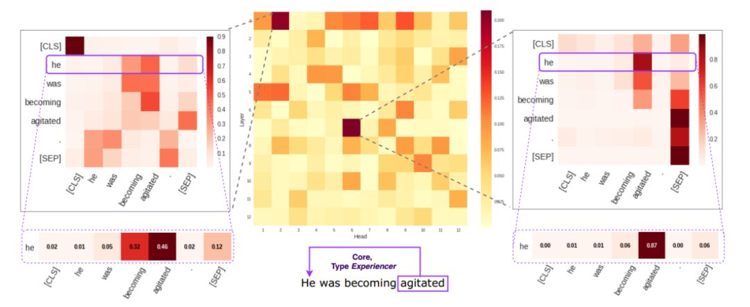 在这一点上,有几项研究试图找出自注意力的头编码特定类型的信息,但大多数集中在语法上。我们做了一个实验,关注框架语义元素:我们从FrameNet 1.7抽取了473个句子,最多12个标记的长度,并且核心框架元素距离目标词至少2个标记。在下面的例子中,是体验者和分词之间的关系唤起了emotion_directframe。可以说,这种关系对于理解一个给定的句子所描述的情况是至关重要的,任何声称能够提供语言信息的自注意力图的机制都应该反映出这些关系(可能包括许多其他关系)。