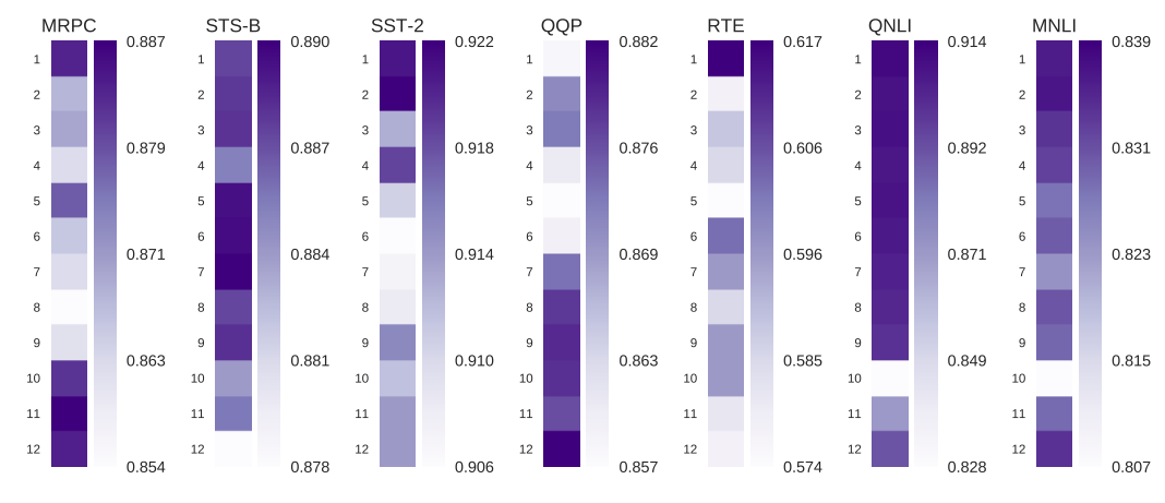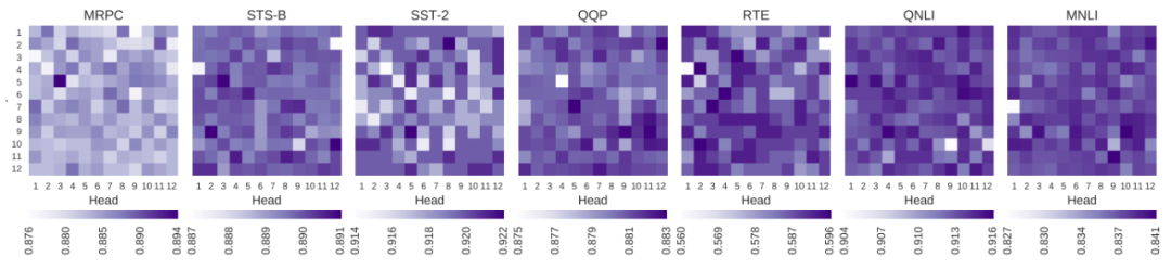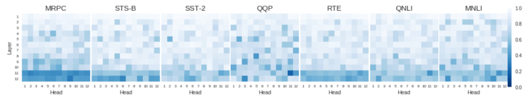 为了确定我们认为对帧语义关系编码有用的两个头是否真的被finetune过的BERT使用,我们进行了一项消融研究,一次禁用一个头(即用统一注意力替换习得的注意力权重)。图6显示了在我们的示例中所有GLUE任务的热图,每个单元格显示的是总体性能,当给定的头被关闭。很明显,虽然整体模式不同任务之间,我们最好随机删除头 —— 包括那些我们确认为编码有意义的信息,应该为最相关的任务。许多头也可以在不影响任何性能的情况下关闭,这再次表明,即使是BERT-base也严重参数化了。