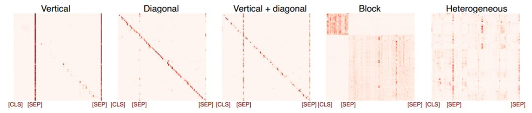 那么BERT的自注意力模式是什么呢?我们找到了五个,如下图所示: