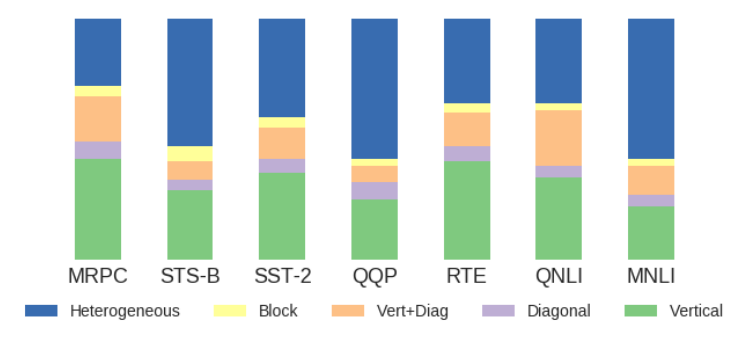 以下是BERT在七项GLUE任务中五种注意力的比例(每一列代表所有层中所有头部的100%):