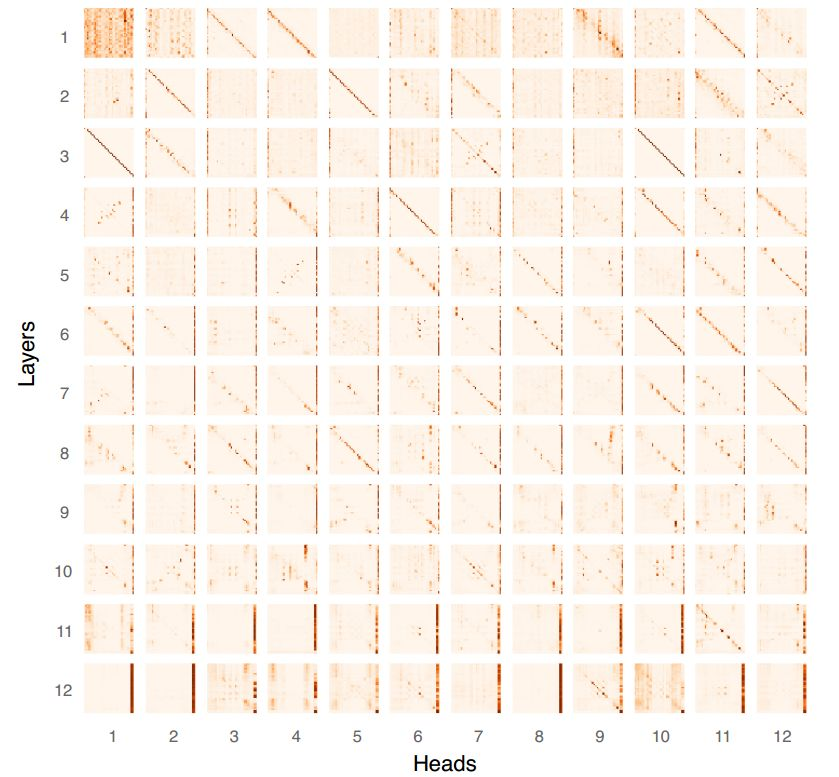 垂直模式表示对单个标记的关注,它通常是[SEP]标记(表示句子结束的特殊标记)或[CLS]标记(作为提供给分类器的完整序列表示使用的特殊BERT标记)。