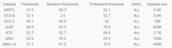 从正态分布中随机初始化模型,并对任务数据集进行3个epochs的finetune,然后看看BERT的表现