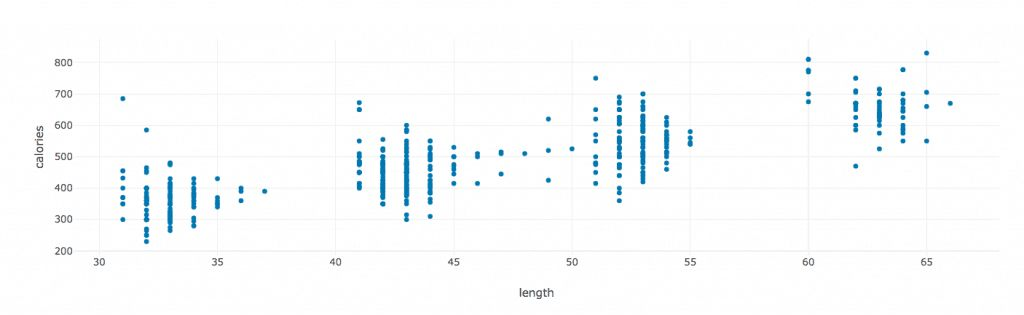 正如你所看到的,视频长度和卡路里之间是正相关的。但是相关性还没有强到可以丢弃。40-45分钟的视频消耗的卡路里与30-35分钟、50-55分钟甚至60分钟以上的视频消耗的卡路里重叠。因此,我们保留了它们。