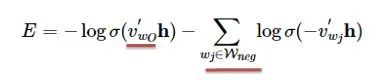 损失函数,一部分是正样本(期望输出的词),另一部分是负采样随机抽取出来的负样本集合,V wo是输出向量