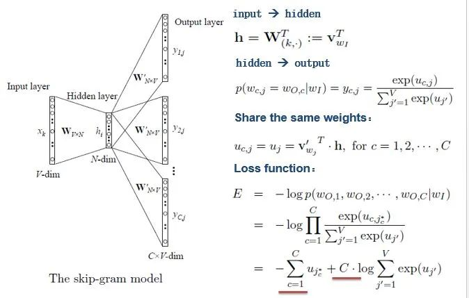 skip-gram model是通过输入一个词去预测多个词的概率。输入层到隐藏层的原理和simple CBOW一样,不同的是隐藏层到输出层,损失函数变成了C个词损失函数的总和,权重矩阵W 还是共享的。