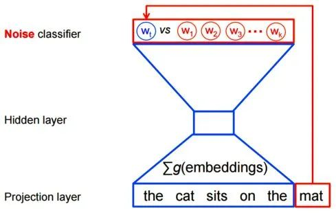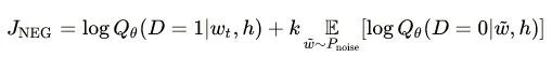 其中,Qθ(D=1|w,h)为二元逻辑回归的概率,具体为在数据集 D中、输入的embedding vector θ、上下文为 h的情况下词语 w 出现的概率;公式后半部分为 k 个从 [噪声数据集] 中随机选择 kk个对立的词语出现概率(log形式)的期望值。可以看出,目标函数的意义是显然的,即尽可能的 [分配(assign)] 高概率给真实的目标词,而低概率给其他 k 个 [噪声词],这种技术称为负采样(Negative Sampling)。