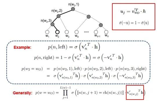 假设我们要计算W2叶子节点的概率,我们需要从根节点到叶子结点计算概率的乘积。我们知道,本模型替代的只是原始模型的softmax层,因此,某个非叶子节点的值即隐藏层到输出层的结果仍然是uj,我们对这个结果进行sigmoid之后,得到节点往左子树走的概率p,1-p则为往右子树走的概率。关于这棵树的训练方式比较复杂,但也是通过梯度下降等方法,这里不详述,感兴趣的可以阅读论文word2vec Parameter Learning Explained。