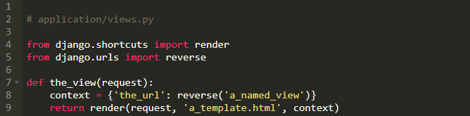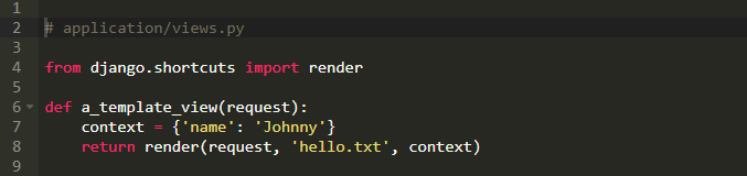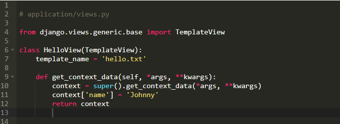 看到TemplateView,你可能会回想起上一篇文章。在那些例子中,我们提供一个模板名字,然后我说到Django会处理剩下的事情。现在你开始理解Django获取模板名字,然后调用类似render的代码来生成一个HttpResponse。当时,那些例子缺少与模板结合起来的上下文数据。下面是一个完整的例子复现上述过程,代码如下: