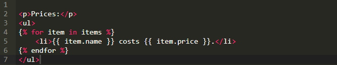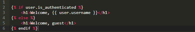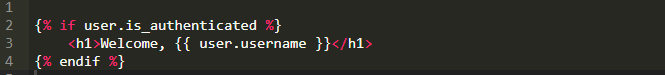 这个例子只包含一个当用户登录到应用时欢迎信息的HTML头部标签。我们用if标签开始这个例子。注意观察if标签结尾需要一个endif标签。模板必须认真对待空格,因为布局依赖那些空格。模板语言不能像在Python中那样用空格来表示范围,所以需要用结束标签。你可能猜到了,在if/endif标签对中间也可以有else和elif标签。