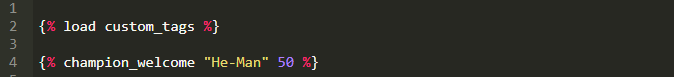 这个搞笑的欢迎标签会处理多个输入变量并且根据提供的级别进行变化。这个例子的中会显示“Hello great champion He-Man!”。