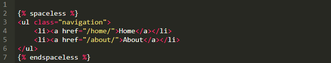 当你用CSS的时候,在那些列表项前面缩进的空格(或者跟着它们的下一行字符)可能会给你带来麻烦。意识到空格可能影响布局这个问题,我们可以像下面这样使用spaceless标签: