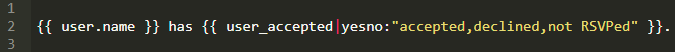 在我们学习的旅程中,最后一个是yesno标签。yesno适合将True|False|None转换成有意义的文本消息。想象我们创作一个应用追踪各种事件,用户注意力集中在三个值中的某一个。我们模板可能看起来像这样。