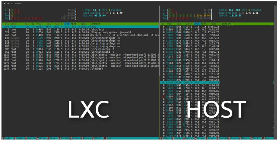 正如你可以在下图中看到的,左侧是 LXC 虚拟的 Ubuntu ,默认安装使用 11 MB 大小。