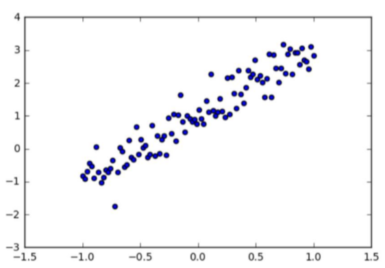 本例我们将通过代码来生成一个人工数据集。随机生成一个近似采样随机分布,使得w=2.0,b=1,并加入一个噪声,噪声的最大振幅为0.4。即方程表示为: