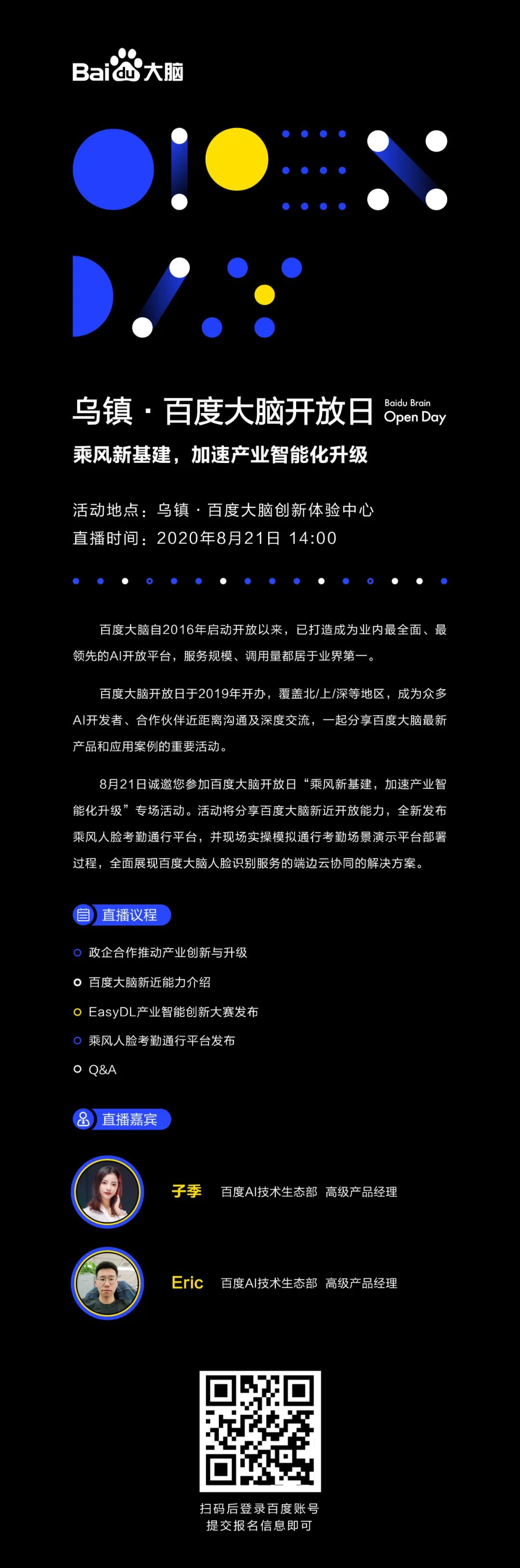 如今,AI 发展尖端模式下的厂商们也逐步进行开源,为人脸识别在更多领域的应用不断突破瓶颈。2020 年 8 月 21 日 14:00 百度大脑开放日“乘风新基建,加速产业智能化升级”专场活动将在乌镇盛大开启。