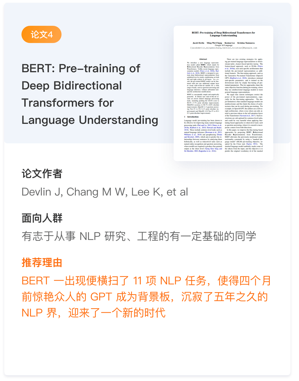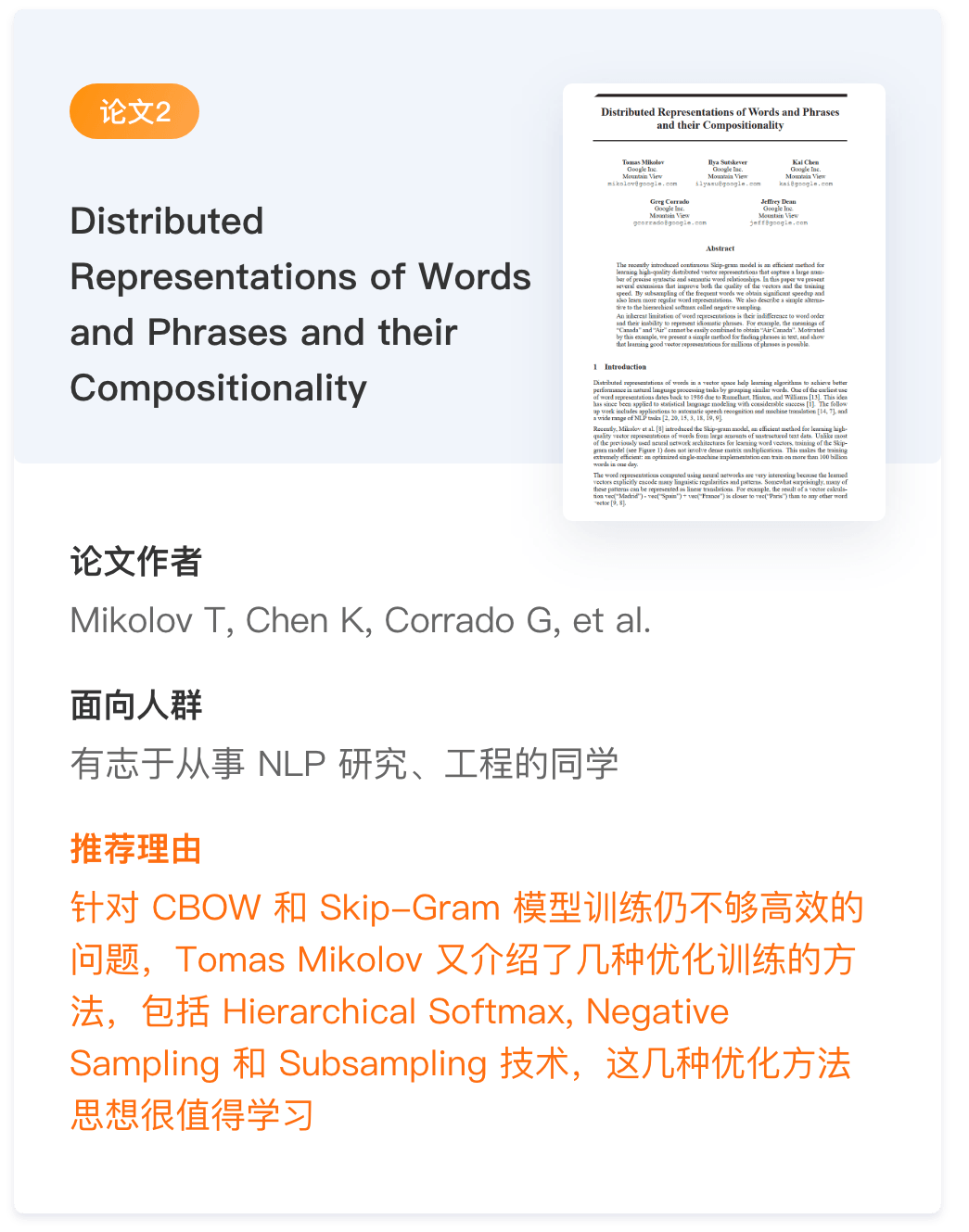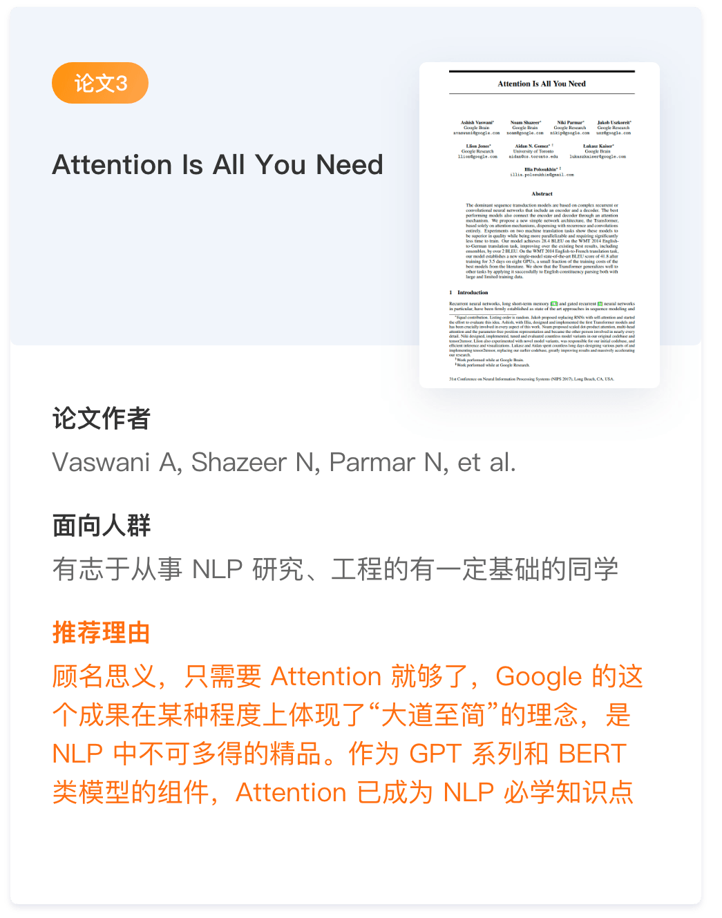 这5篇论文包含了情感分析的各个领域,并且有情感分析领域最具影响力的学者之一的刘兵老师。NLP 必学知识点BERT 、 GPT 、Attention 、 CBOW 、 Skip-Gram 、还包含了几种优化方法:Hierarchical Softmax、Negative Sampling 、Subsampling 技术。这些论文将给你的NLP情感分析奠定了理论基础。