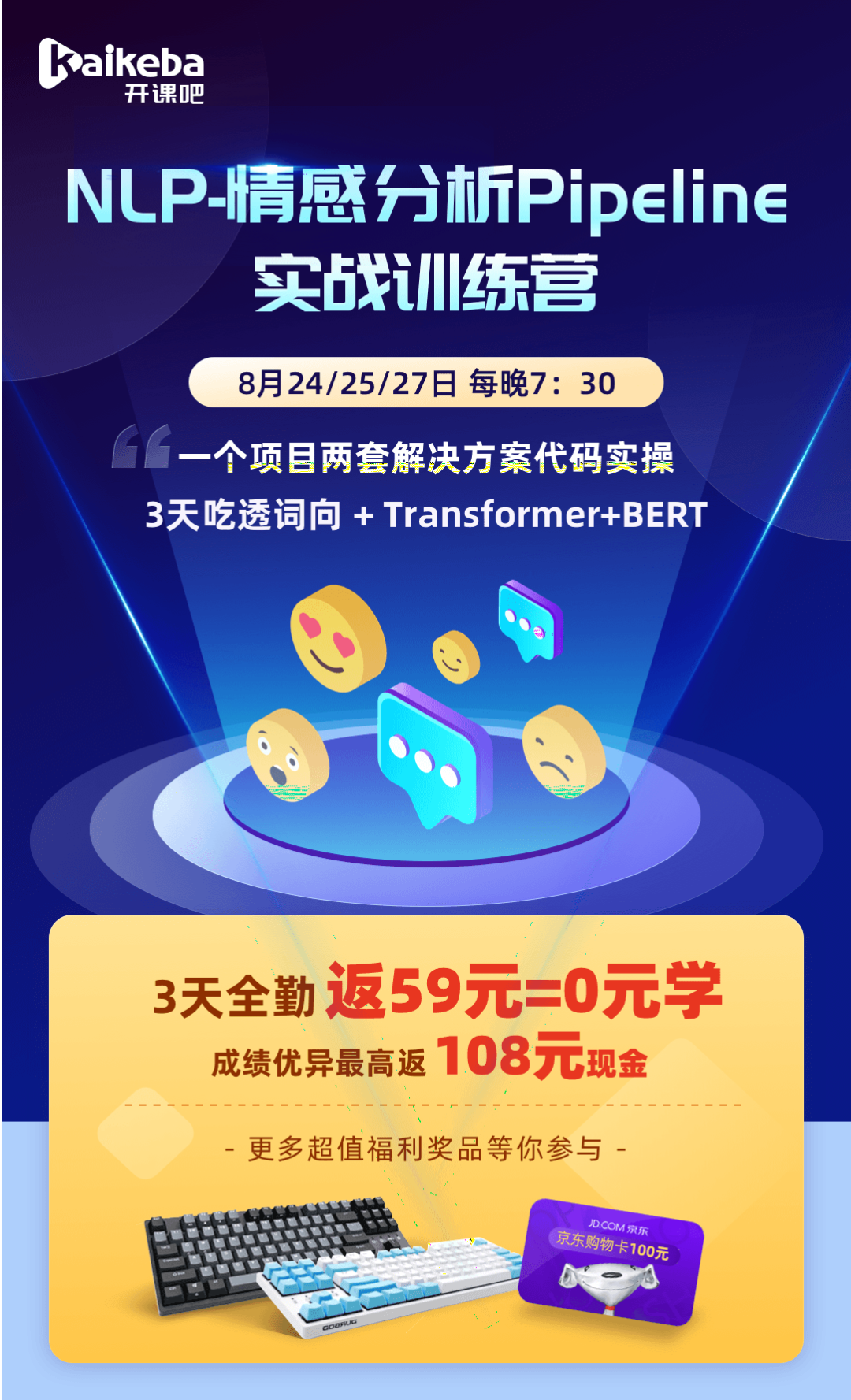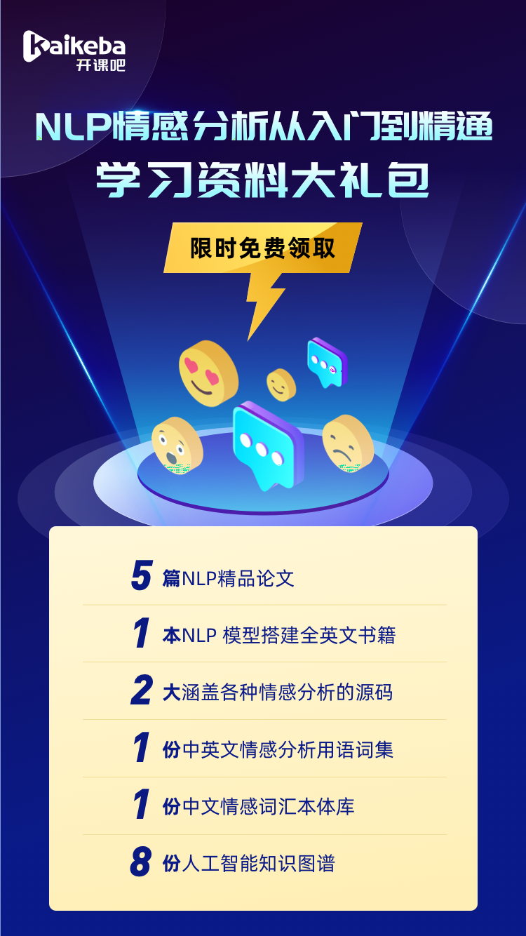 那么,如何掌握基于情感词典分析方法?情感分析中的GPT 系列和 BERT 类模型又是如何使用?别急,今天,给大家推荐一份由 开课吧 提供赞助的《NLP情感分析学习资料大礼包》资料。包含了情感分析、词向量、文本挖掘、Pipeline、Word2Vec、Transformer、BERT、 GPT等核心知识 。满足你在学习NLP情感分析的各种需求,成为NLP算法工程师,这个资料是你最好的选择。本号主为大家争取到了免费名额(前150名,还可以获得开课吧NLP付费课程的报名优惠资格)。