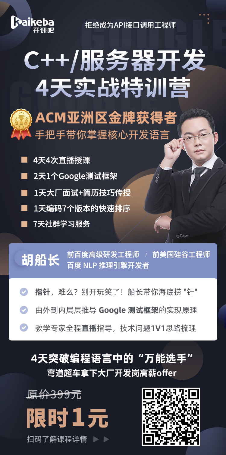 由ACM金牌得主胡船长亲授的C++/服务器开发4天实战特训营,带你深入C++核心编程,完成google测试框架项目,掌握大厂面试技巧。特训营优惠价1元,名额有限。