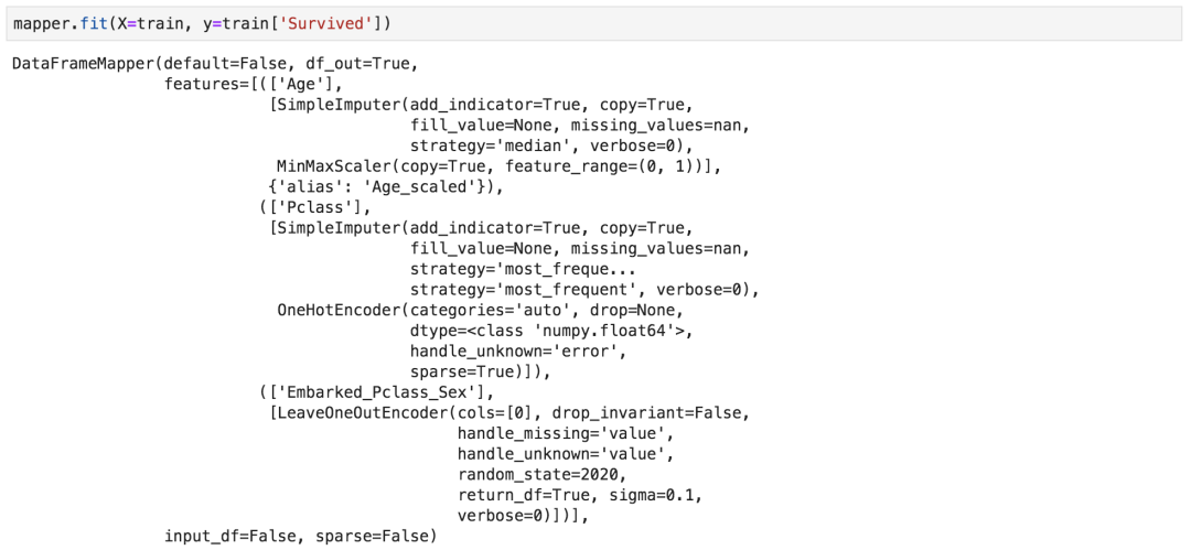 时间长了我们会发现sklearn和pandas搭配有时候代码并不是十分整洁,中间的操作环节比较多。推荐一个连接sklearn和pandas的库包,它叫sklearn_pandas。它将sklearn的ColumnTransformer替换为pandas的DataFrameMapper。用起来无缝连接,和直接使用sklearn的ColumnTransformer毫无区别。