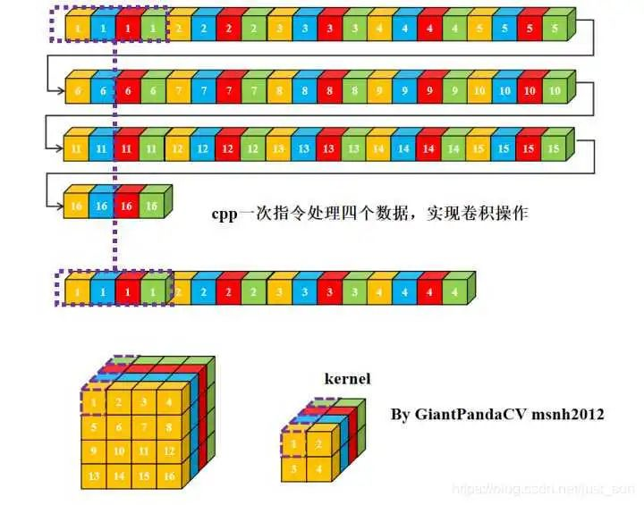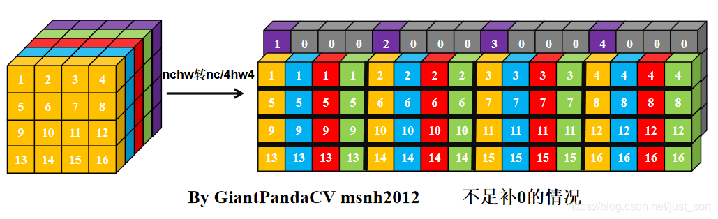 现在有一条指令处理4组数据的能力, 比如x86结构的sse指令,arm的neon指令.以及GPGPU的OpenGL和OpenCL,单次处理RGBA四组数据. 如果继续使用nchw内存排布的话, 是这样的.