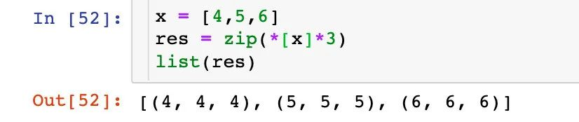[x]是一个列表中含有列表,x本身就是一个列表[x]*3结果为[x,x,x],实际上也是[[4,5,6],[4,5,6],[4,5,6]][*[x]*3]的结果则为[(4,4,4),(5,5,5),(6,6,6)]