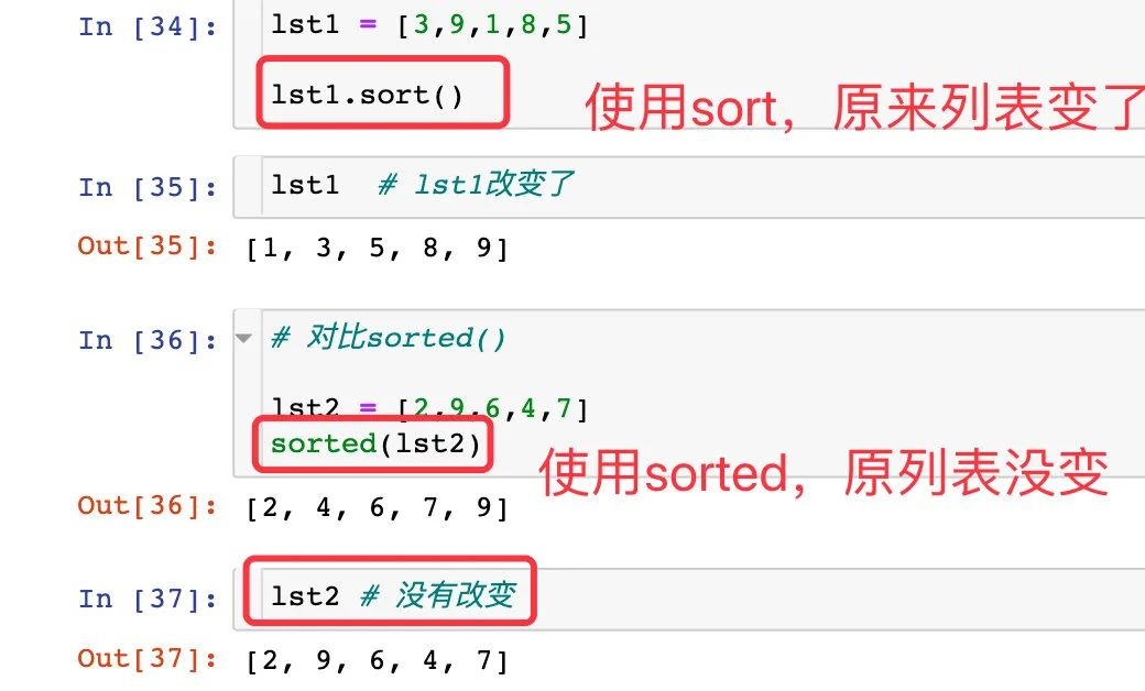 结果是将原来的列表直接原地修改,而sorted 是生成新的列表,二者是不同的
