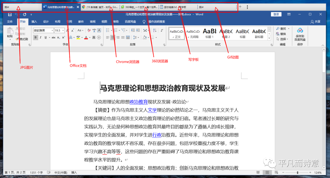 以上图为例,它可以把JPG图片、GIF动图、Office文档、Chrome浏览器、360浏览器组织到同一个窗口下。