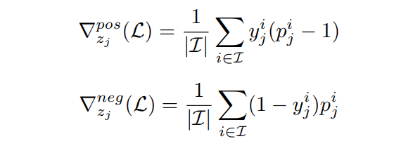 例如,大量负面影响所积累的负梯度可能比一些正面影响所产生的正梯度要小。因此,可以直接选择梯度统计量作为衡量一个任务是否处于均衡训练状态的指标。每个分类器的输出 相对于损失 的正梯度和负梯度表达式为: