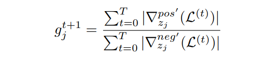 梯度引导Reweighing的基本思想是:根据分类器正梯度与负梯度的累积梯度比,分别对每个分类器的正梯度和负梯度进行加权。为此,先定义 为任务 的累计正梯度与负梯度的比值,直到迭代 。然后在此迭代中,正梯度 和负梯度 的权重可计算如下: