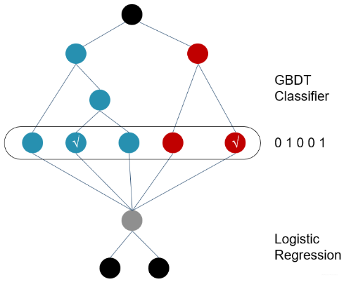 比如上图中, 有两棵树,x为一条输入样本,遍历两棵树后,x样本分别落到两颗树的叶子节点上,每个叶子节点对应LR一维特征,那么通过遍历树,就得到了该样本对应的所有LR特征。构造的新特征向量是取值0/1的。比如左树有三个叶子节点,右树有两个叶子节点,最终的特征即为五维的向量。对于输入x,假设他落在左树第二个节点,编码[0,1,0],落在右树第二个节点则编码[0,1],所以整体的编码为[0,1,0,0,1],这类编码作为特征,输入到线性分类模型(LR or FM)中进行分类。
