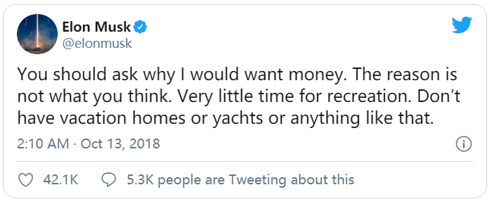 出生在南非马斯克的一系列推文中曾表示,他想要很多钱的原因“不是你想的那样”。他说自己“几乎没有时间娱乐” ,也没有“度假屋、游艇或类似的东西”。