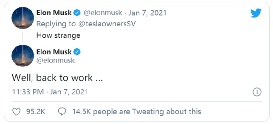 按照马斯克真正的风格,他在推特上承认了这一里程碑事件,并指出“多么奇怪”和“好了,回去工作吧”。