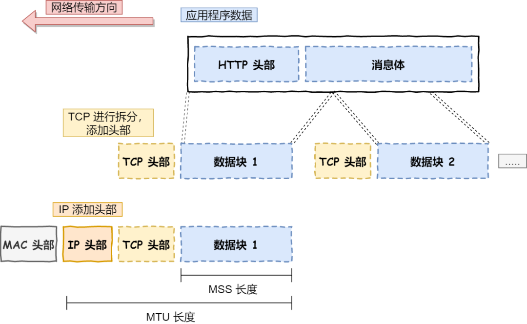 应用需要传输的数据可能会非常大,如果直接传输就不好控制,因此当传输层的数据包大小超过 MSS(TCP 最大报文段长度) ,就要将数据包分块,这样即使中途有一个分块丢失或损坏了,只需要重新这一个分块,而不用重新发送整个数据包。在 TCP 协议中,我们把每个分块称为一个 TCP 段(TCP Segment)。