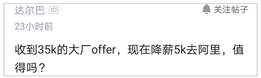 近日,有网友发帖称:自己手握35K大厂Offer,降薪5k去阿里,值得吗?