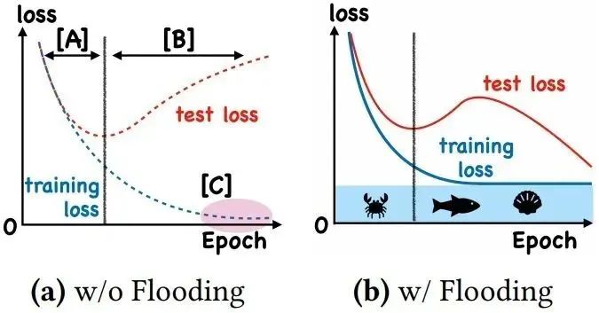 当training loss大于一个阈值时,进行正常的梯度下降;当training loss低于阈值时,会反过来进行梯度上升,让training loss保持在一个阈值附近,让模型持续进行“random walk”,并期望模型能被优化到一个平坦的损失区域,这样发现test loss进行了double decent。