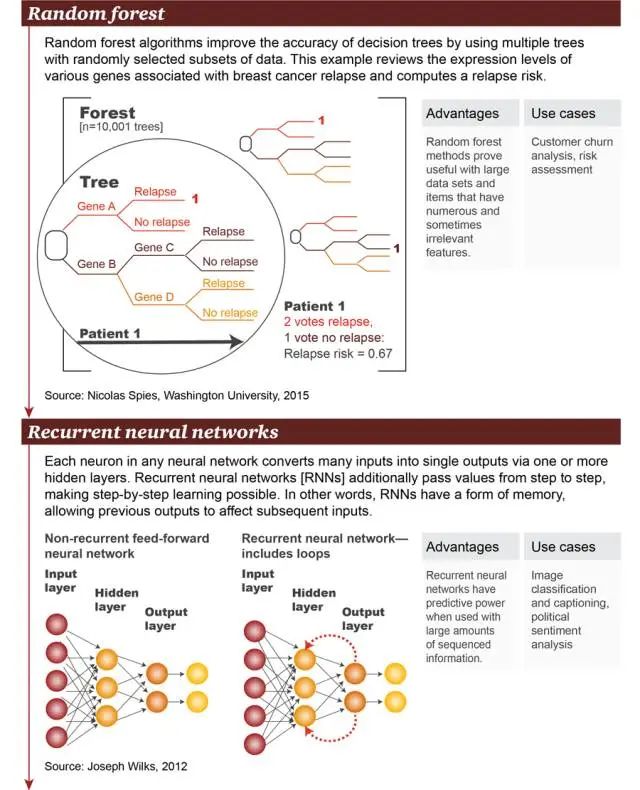 6. 随机森林(Random forest):随机森林算法通过使用多个带有随机选取的数据子集的树(tree)改善了决策树的精确性。本例在基因表达层面上考察了大量与乳腺癌复发相关的基因,并计算出复发风险。