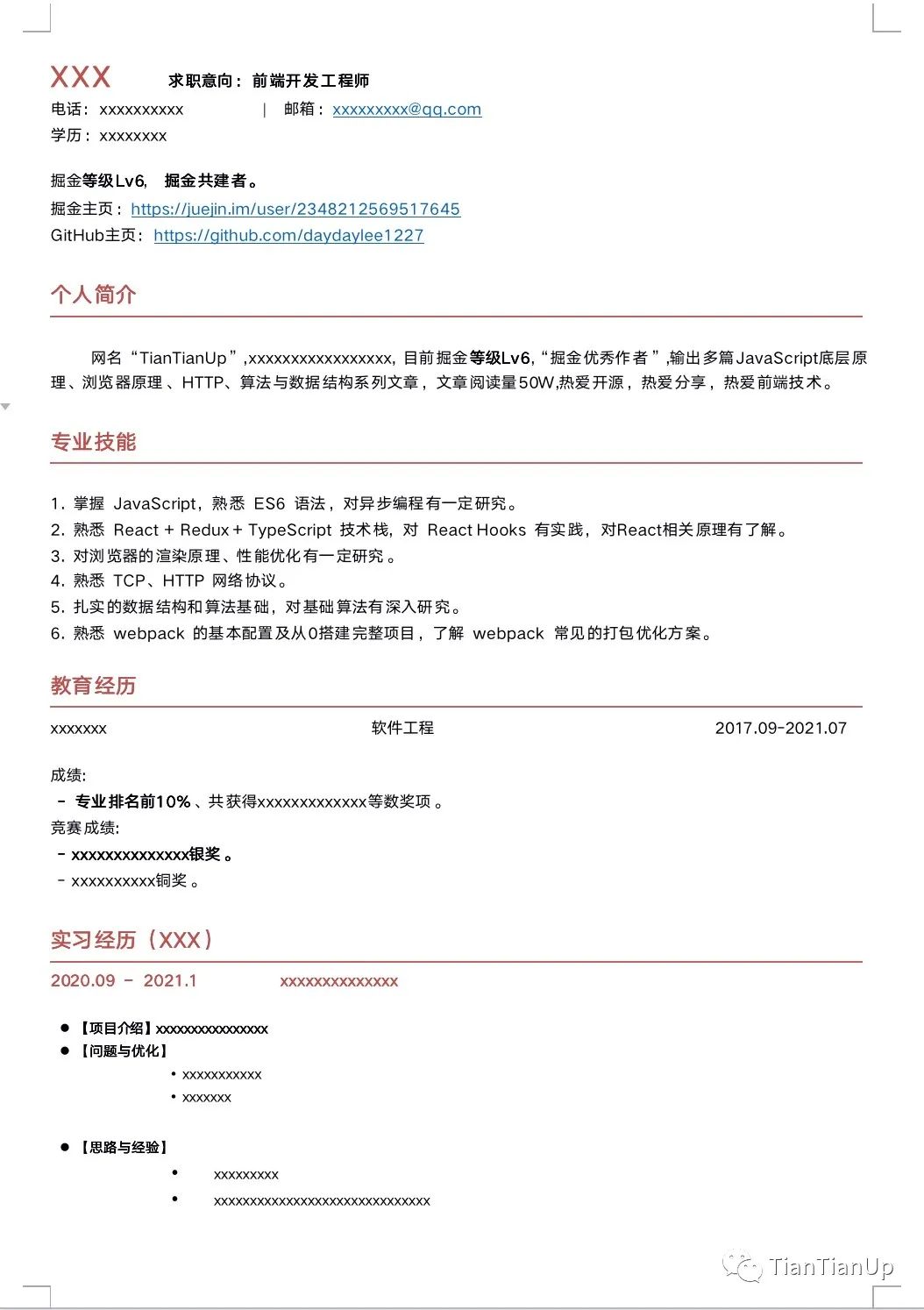 需要获取简历模板pdf的话,私信我(文末有联系方式),或者公众号回复,个人简历,即可获取。