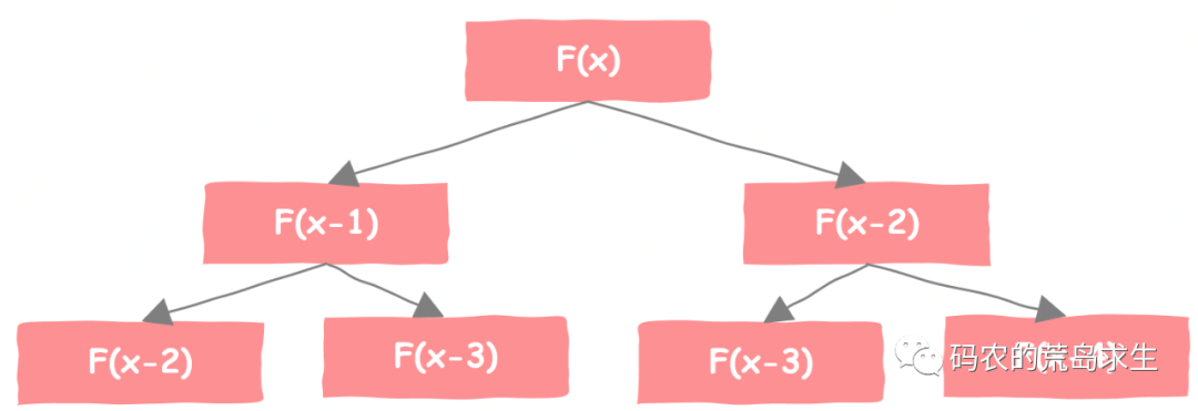这个递归公式在表达什么呢?f(x)的值依赖f(x-1),f(x-1)的值又依赖f(x-2),f(x-2)的值又依赖。。。
