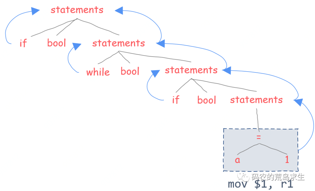 现在代码被表示成了树的形式,你仔细观察后发现,其实叶子节点的表达是非常简单的,可以很简单的翻译成对应的机器指令,只要叶子节点翻译成了机器指令,你就可以把此结果应用到叶子节点的父节点,父节点又可以把翻译结果引用到父节点的父节点,一层层向上传递,最终整颗树都可以翻译成具体的机器指令。