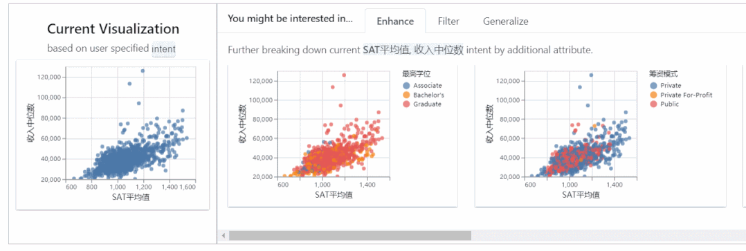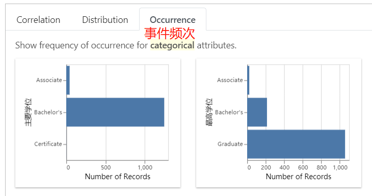 LUX显示有三种类型的图表,代表的统计学含义分别是相关性、直方分布、事件频次。