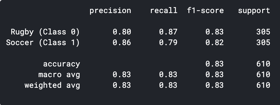 print(classification_report(y_val, predictions, target_names = ['Rugby (Class 0)','Soccer (Class 1)']))