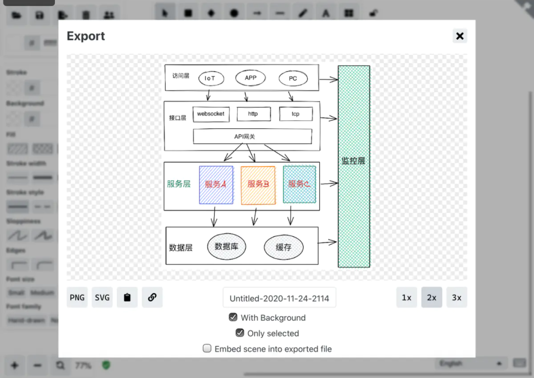 可以将形状保存到个人库中以备将来使用,还可以到出PNG和SVG格式的图片,另外也支持生成一个只有查看权限的web链接。