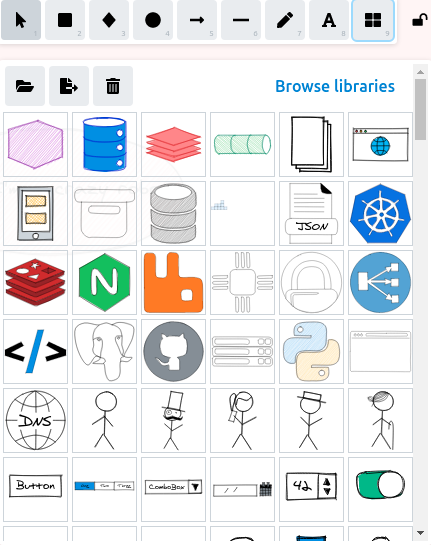 如果要从库中选择新形状,单击顶部工具栏上的方形图标,然后选择要添加的图标。另外,单击浏览库可以从 Excalidraw 库下载更多好看的手绘形状。比如下面这些就是东哥下载的一些编程语言和数据库的手绘logo。