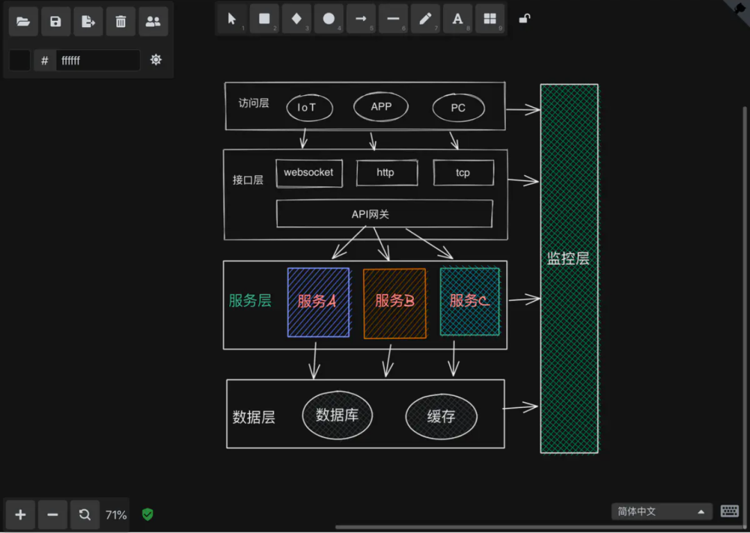 本次再给大家分享一个强大的流程图工具 Excalidraw,可以把它当作一个虚拟的白板,风格更偏向于手绘,通过简单地“托拉拽”即可完成流程图。下面我们一起看下Excalidraw的功能: