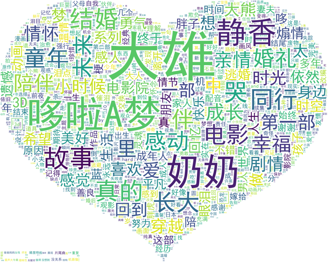 从词云图大致可以看出:这又是一部催泪电影,这是一部情怀电影,陪伴我们长大的大雄都结婚了?那我们呢?其实我们小时候,就盼望着大雄和静香能够是好盆友,就在这部电影,他们结婚了。这部电影应该怎么上演呢?大家可以去电影院一探究竟。