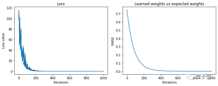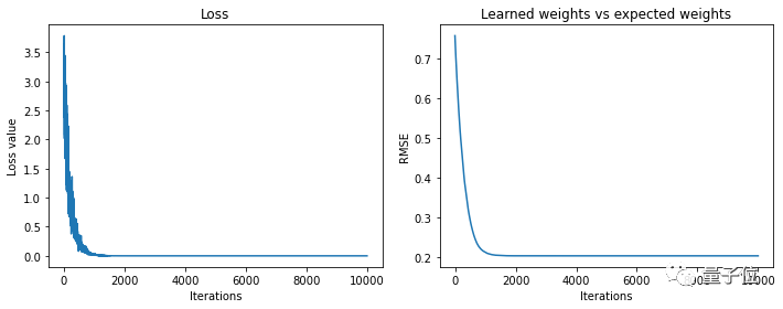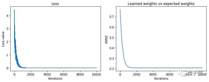 Final loss value 2.2379359316633115e-21Final weights' rmse value 0.2080118219691059