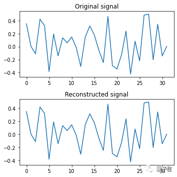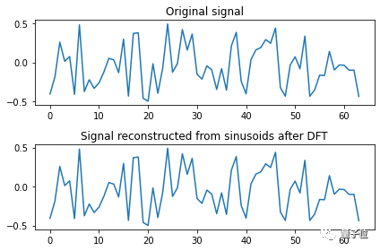 import matplotlib.pyplot as plty_real = y[:, :signal_length]y_imag = y[:, signal_length:]tvals = np.arange(signal_length).reshape([-1, 1])freqs = np.arange(signal_length).reshape([1, -1])arg_vals = 2 * np.pi * tvals * freqs / signal_lengthsinusoids = (y_real * np.cos(arg_vals) - y_imag * np.sin(arg_vals)) / signal_lengthreconstructed_signal = np.sum(sinusoids, axis=1)print('rmse:', np.sqrt(np.mean((x - reconstructed_signal)**2)))plt.subplot(2, 1, 1)plt.plot(x[0,:])plt.title('Original signal')plt.subplot(2, 1, 2)plt.plot(reconstructed_signal)plt.title('Signal reconstructed from sinusoids after DFT')plt.tight_layout()plt.show()